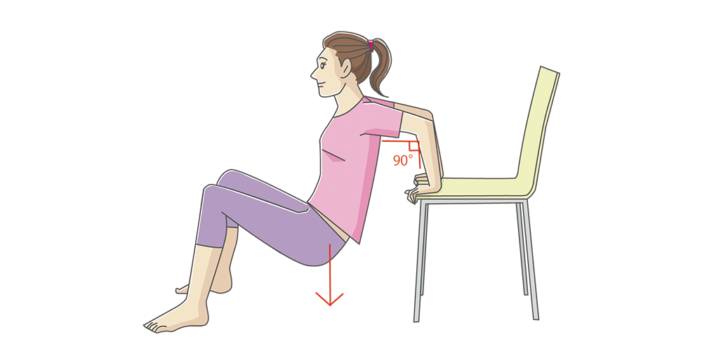 - 肘が90度になりまで、ゆっくりと体を下ろしていきます。お尻は地面につかないようにします。