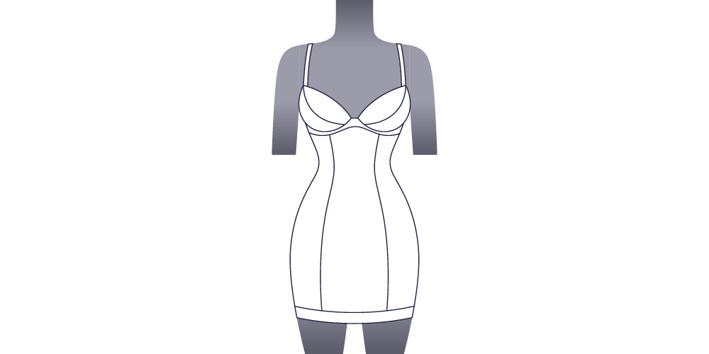 ストラップや肩紐がなく、丈がウエストまであるブライダルインナーです。ブラジャーとウエストニッパーが一体化しており、上半身の補正が一枚で済みます。