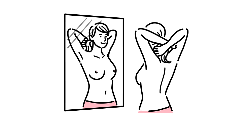 ②腕を下げた状態で両方の乳房に違和感がないか確認します。