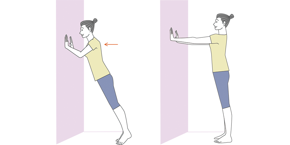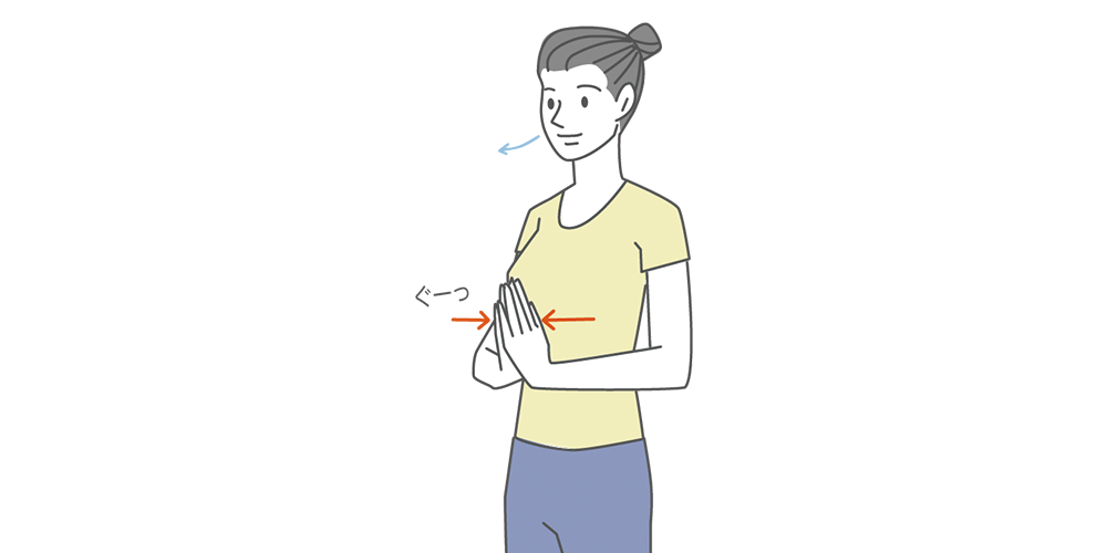 - 背筋をまっすぐにして立ち、手を胸の前で合わせる。手首から肘が床と平行になるように、両手を押し合う。