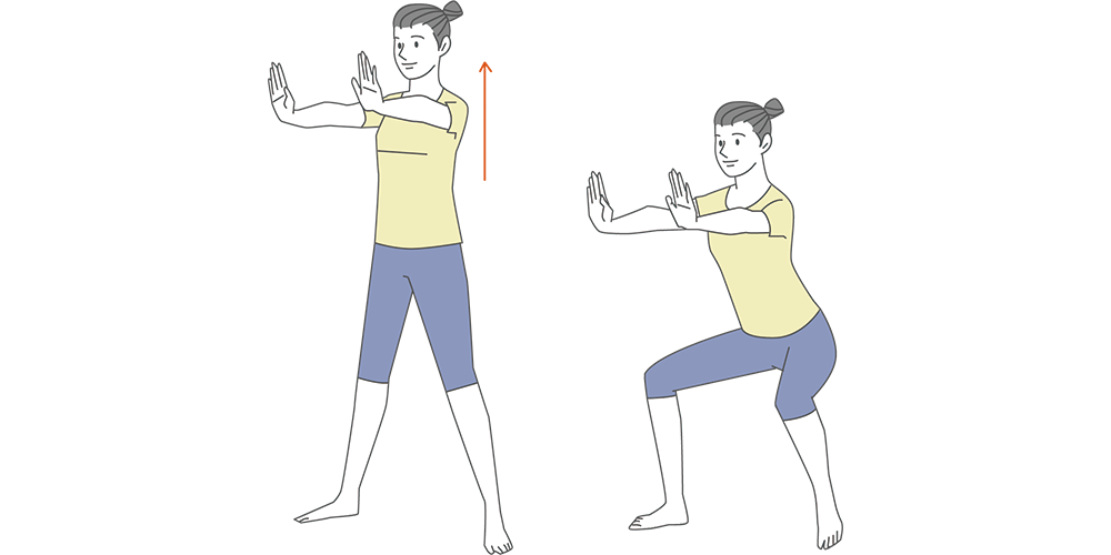 - つま先を正面に向け、肩幅のサイズに足を開く